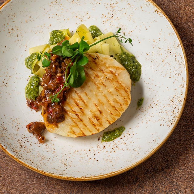 Cook the celeriac sous-vide and grill the celeriac steaks on both sides. Cook the tagliatelle and mix with pesto. Serve with the steak and a spoonful of tomato compote. Garnish with cress.
