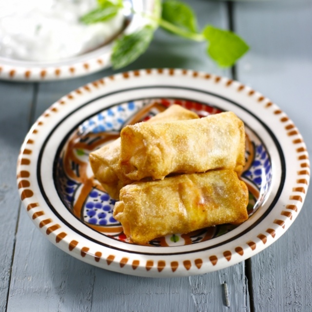 Snijd de koriander fijn. Meng de feta met de harissa en koriander. Snijd de filodeegvellen in vieren. Leg de hoopjes feta erin en vouw ze dicht. Rol de vellen op. Smeer de uiteinde in met een beetje ei. Frituur ze goudbruin en serveer ze met een yoghurtdip.